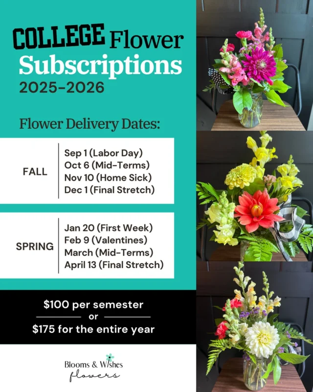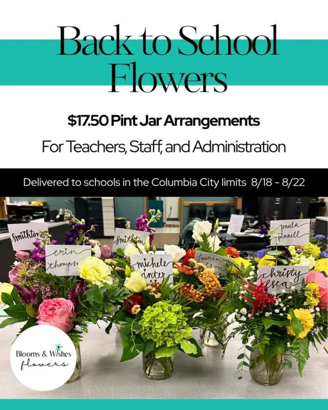 Blooms & Wishes Florist in Columbia, MO - Blooms and Wishes Flower Delivery Your local florist in Columbia, MO. (573) 825-0131 Call or Text Your Order Today Shop Order Now Arrangements Pick from a variety of arrangements made by our skilled local florist living in Columbia, MO. Subscriptions Unique seasonal Flowers delivered to your home, business, or to your favorite person. Events Craft flower creations with friends or host a fun flower team event for your office. Truck Schedule Arrange your own bouquets at our flower stem bar truck, Sallie. Find out where she'll be. Planting seeds of bliss with Columbia's traveling flower truck Read Article Blooms and Wishes in COMO Magazine Read Article Local businesses prepare for Valentine's Day Read Article First Friday brings new faces to Columbia Read Article Instagram Arrangements come in a variety of sizes and shapes Spring subscriptions available. 4 deliveries for $ A few custom arrangements from this week. Let Blooms and Wishes handle some of your holiday Whether you are hosting or a guest, a centerpiece Instagram post 18153996211407567 We are outside Buchroeders today from 10:30-5:30. We love having Nancy as part of the Blooms and Wis Instagram post 17866247310405942 Blog Let's talk about flowers. Sorry, we couldn't find any posts. Please try a different search.